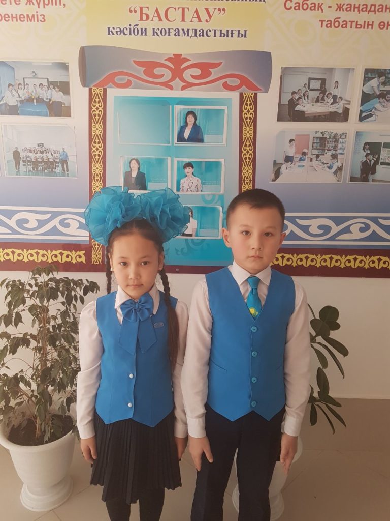 4. Қыздардың мектеп формасы: пиджак, жилет, юбка, шалбар, классикалық жейде, ақ, көк бантик (қысқы уақытта: трикотаж жилет, сарафан, водолазка). Қыздарға арналған шалбарлар еркін тігілген және ұзындығы бойынша тобықты жауып тұрады.