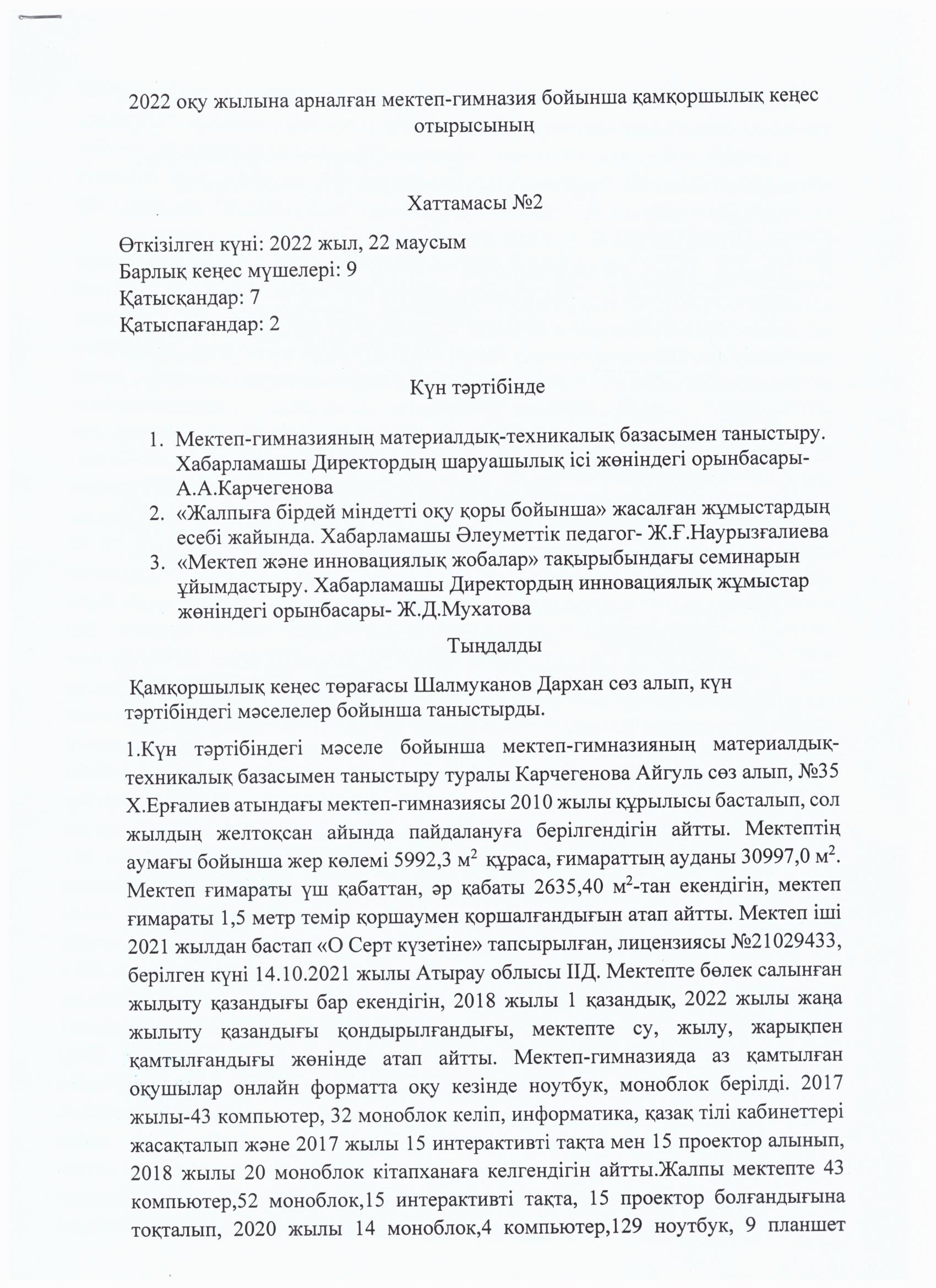 Қамқоршылық кеңесінің №2 отырысының хаттамасы