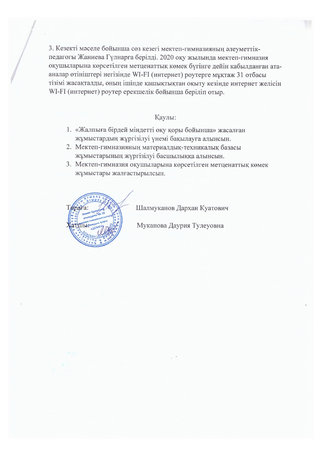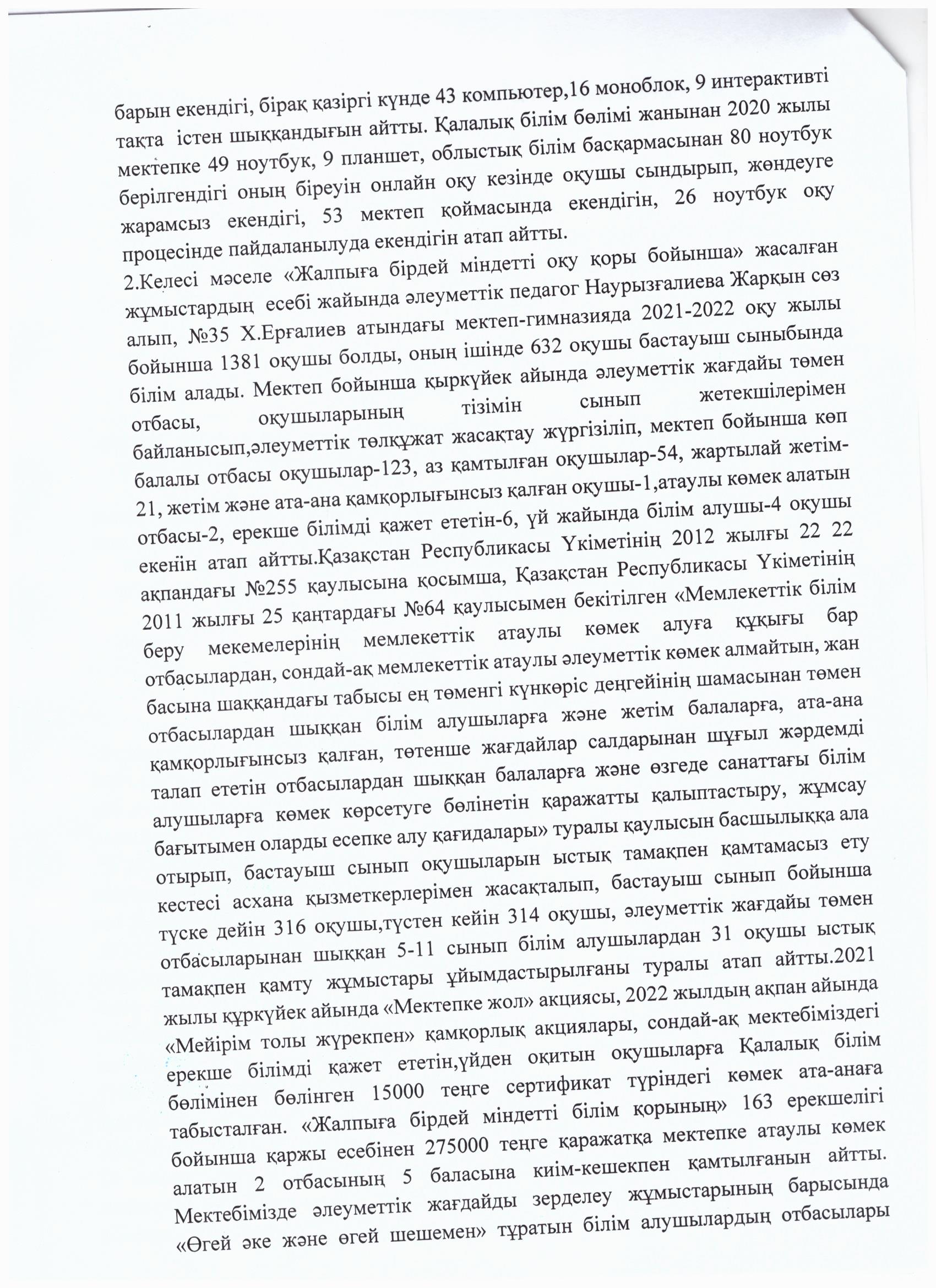 №35 Х.Ерғалиев атындағы мектеп-гимназияда I тоқсан бойынша өткізілген Қамқоршылық кеңестің №1 хаттамасы