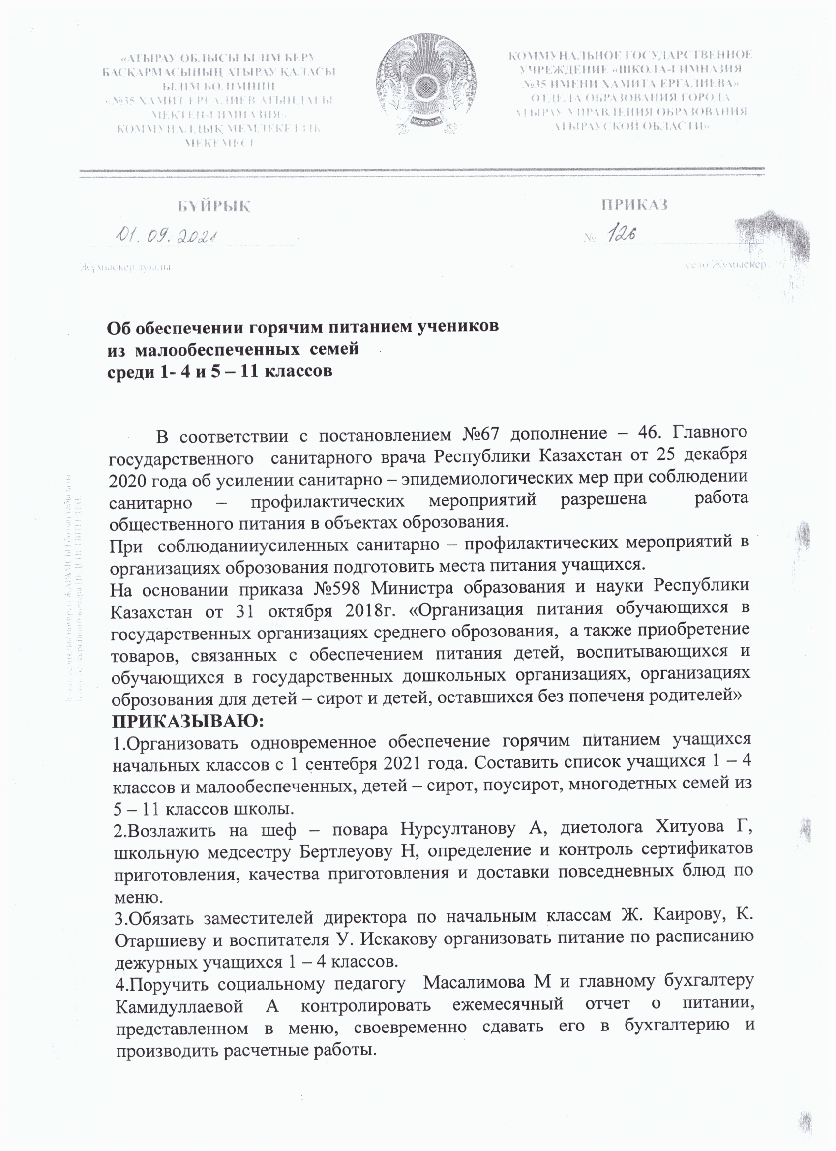 Приказ об обеспечении горячим питанием учеников из малообеспеченных семей среди 1-4 и 5-11 классов